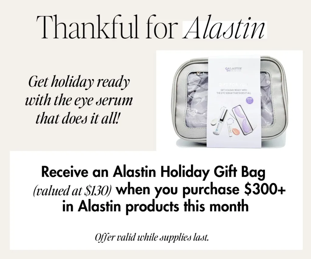 Now’s the perfect time to pause, reset, and get your glow back. Purchase $300+ in any Alastin products this month to get a FREE holiday gift bag containing: